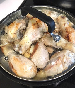 Put back the chicken into the pan, add vinegar sake and ginger and cover