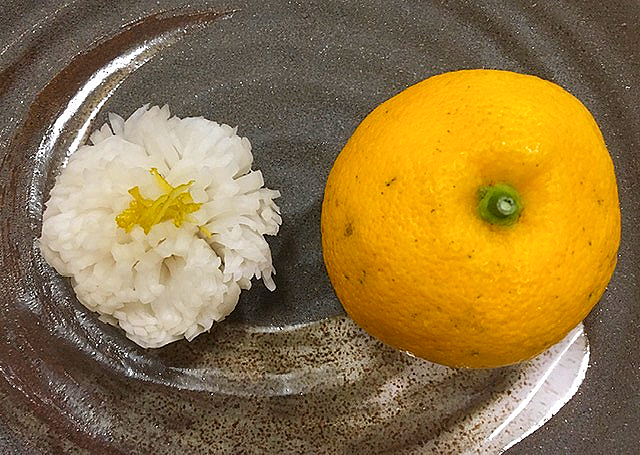 Daikon namasu (thinly cut daikon and carrot, red and white are the color of celebration)